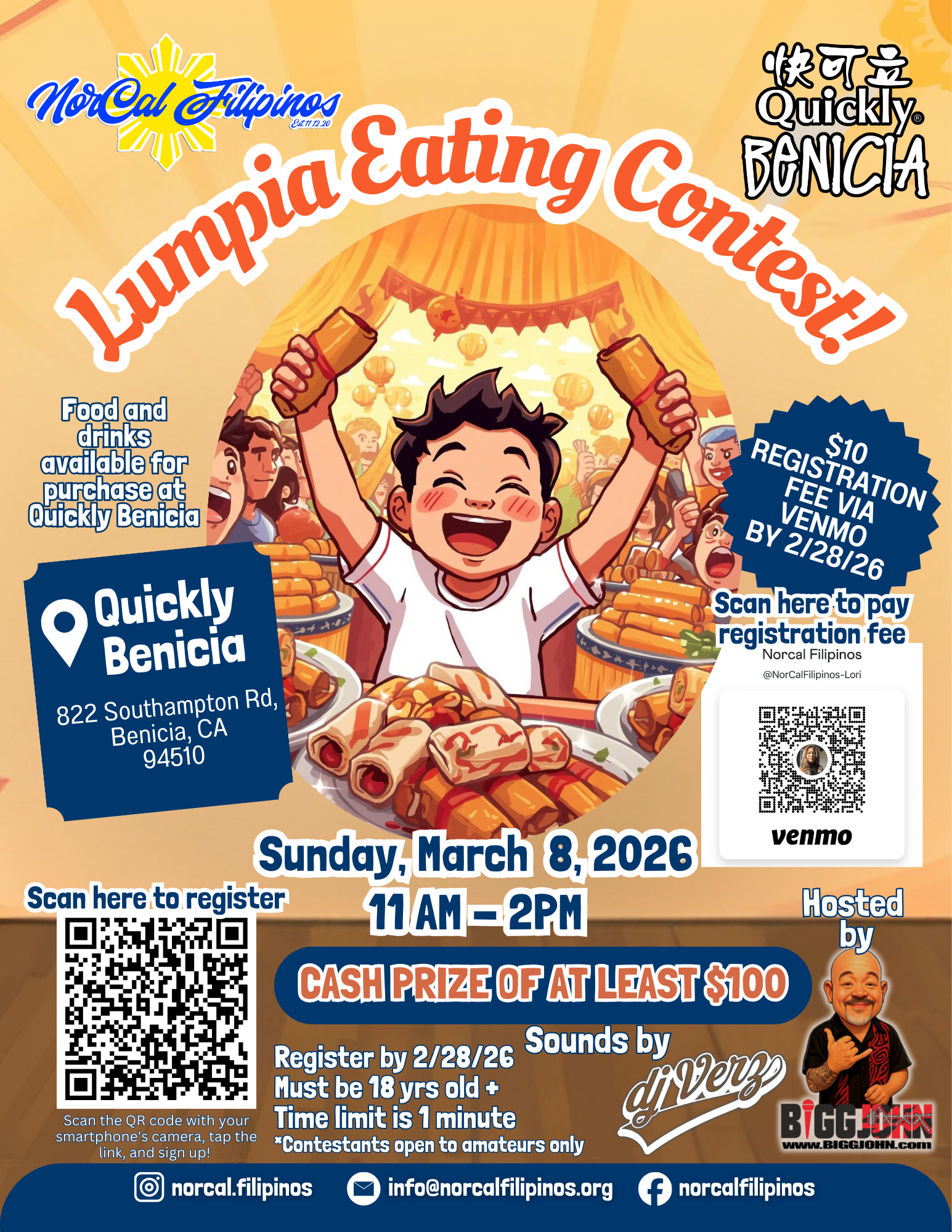 Participant entry is $10 per person, must be 18 yrs old+, complete participant application & payment by Saturday 2/28. Scan the QR codes on the flyer for the application and to pay the entry fee by Venmo. Spectators are free. Cash prize of at least $100. Come join us for some fun and to support NorCal Filipinos! See you there!